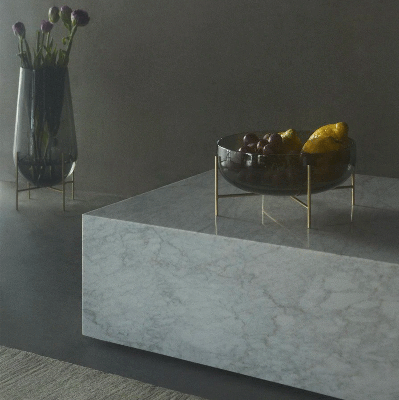 The Échasse Bowl—Available in two sizes in smoked glass and brushed brass, offers a modern, centerpiece-worthy take on the traditional serving bowl. Simple and purposeful, this is counter- and tabletop storage that is both modern and elegant.