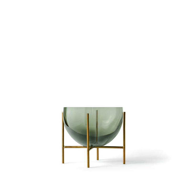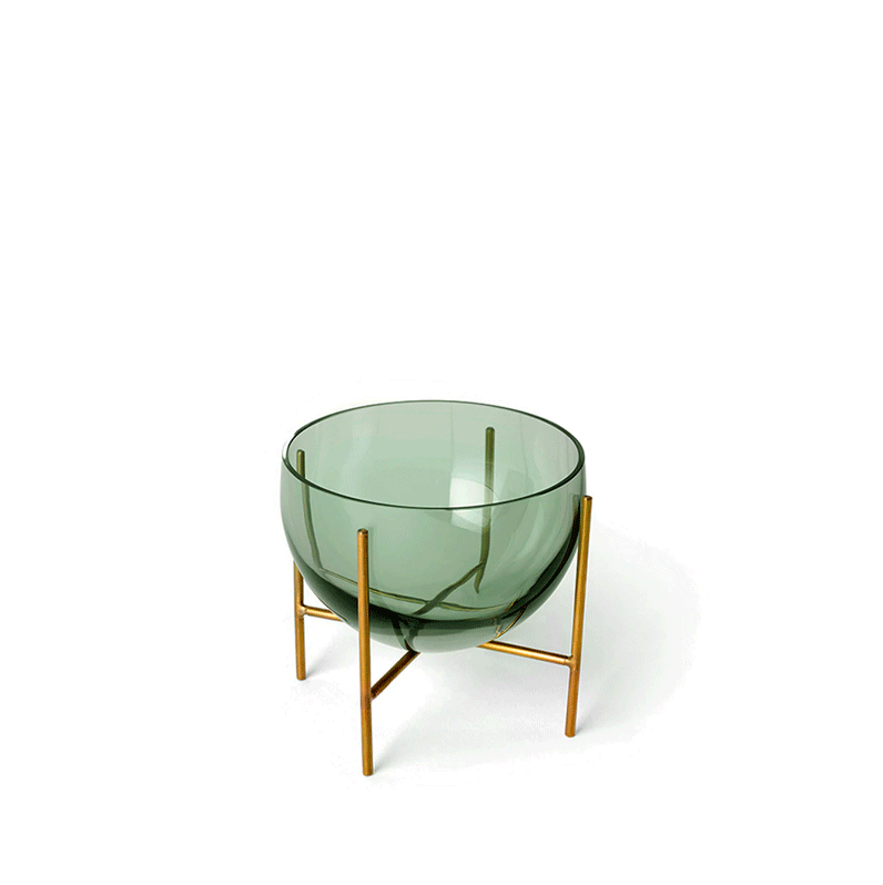 The Échasse Bowl—Available in two sizes in smoked glass and brushed brass, offers a modern, centerpiece-worthy take on the traditional serving bowl. Simple and purposeful, this is counter- and tabletop storage that is both modern and elegant.