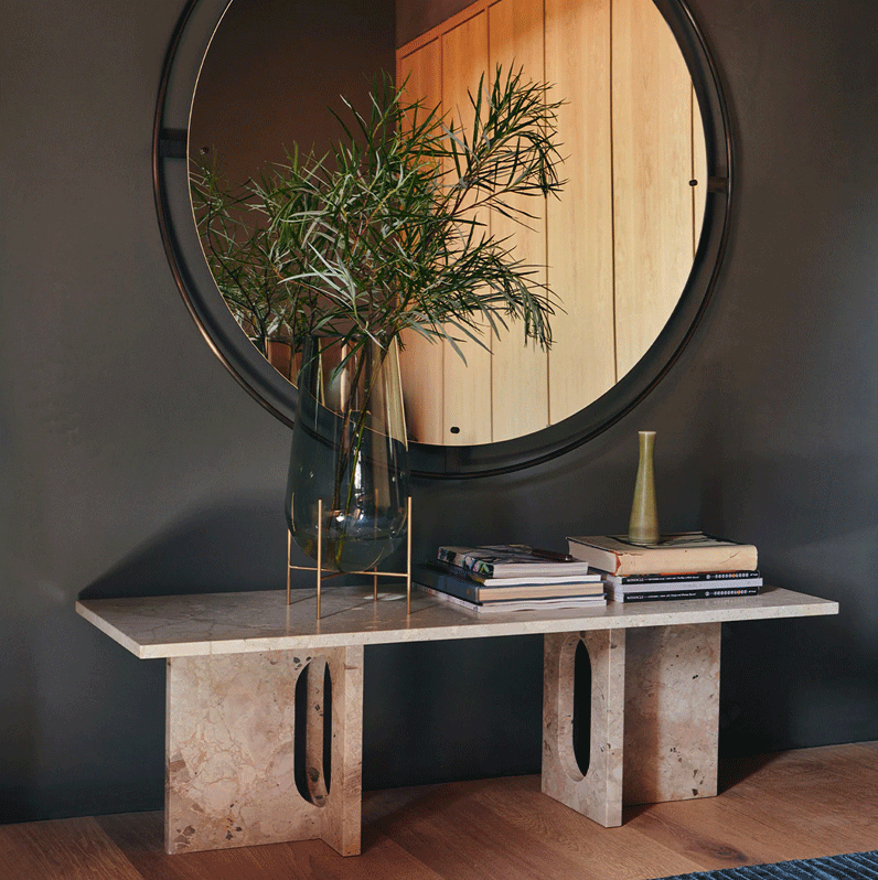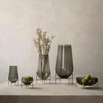 The Échasse Vase—The first piece in the now-iconic Collection was inspired by laboratory test tubes. The drop-shaped form is as elegant when holding flowers on a desk, living room floor, or nightstand as it is when left unfilled. The smoked glass version with brushed brass legs is available in three sizes. The unique colour gradients of the glass give the design depth and contrast against the legs’ clean lines. The smallest vase is now available with clear glass and bronzed brass legs; a classic pairing to complement any interior palette, in a size ideal for more compact spaces.