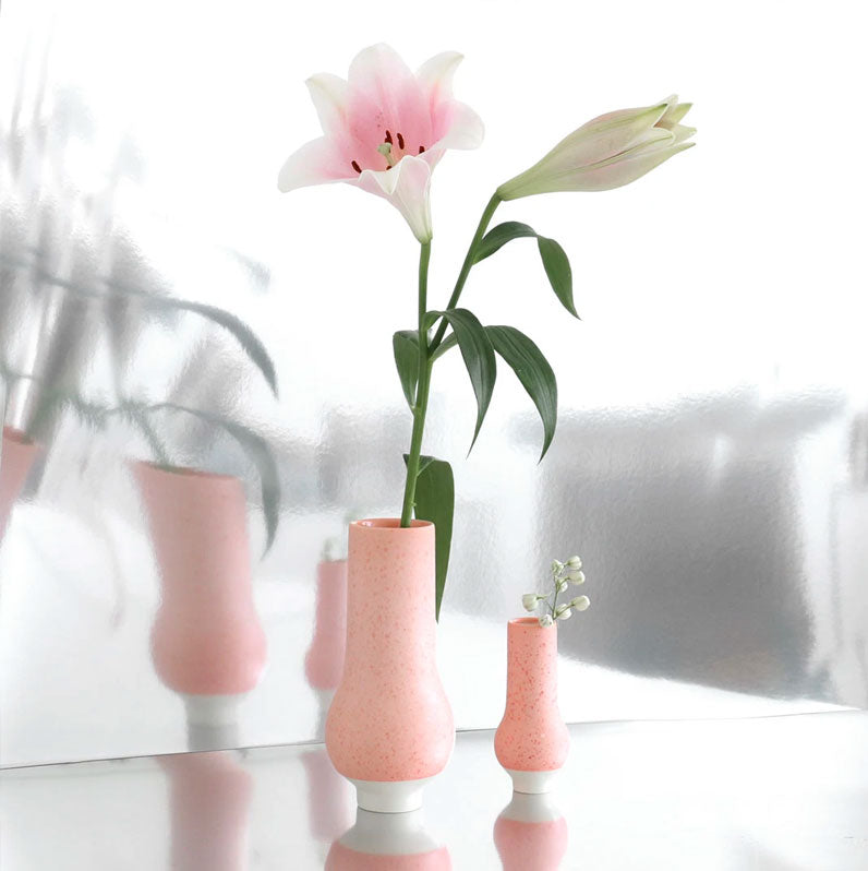 Each Hana Vase shape is available in small or large and a limited range of glaze colors created in-house specifically for this project. This new glaze universe is matte (non-reflective) with glossy speckles that almost sparkle in the light, creating a sensation of cold icy winter snow in the warm spring sun.