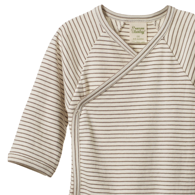 A great option for newborns to avoid having to pull garments over baby's head. Long raglan sleeves and a wrap-around style with a double layer at the front to keep baby’s chest warm.