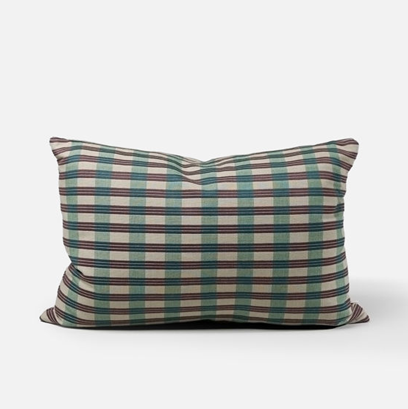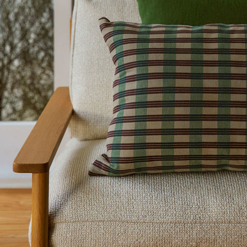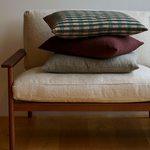 The Folio Cushion Cover features a simple woven grid pattern, blending warm mint and deep boysenberry tones.