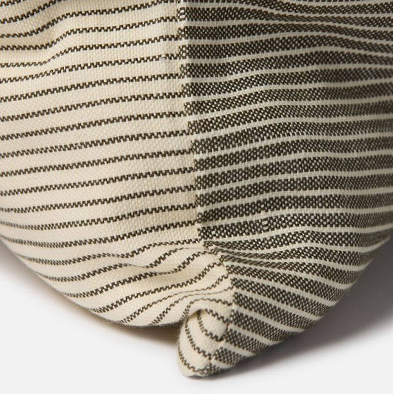 The reversible pinstripe cushion cover offers versatile styling. Featuring creamy coconut and deep ivy hues, it can be displayed on either side to showcase the inverted stripe design. Made with a heavyweight blend of linen and cotton.