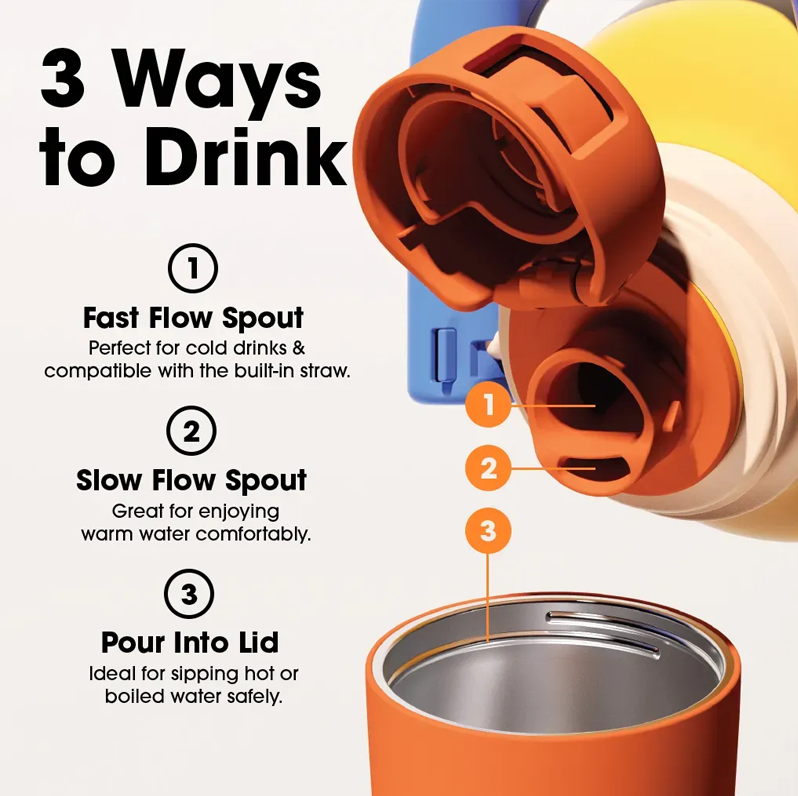 • 3 ways to drink - Use the lid as a cup, or drink directly from the spout with either fast or slow flow options.