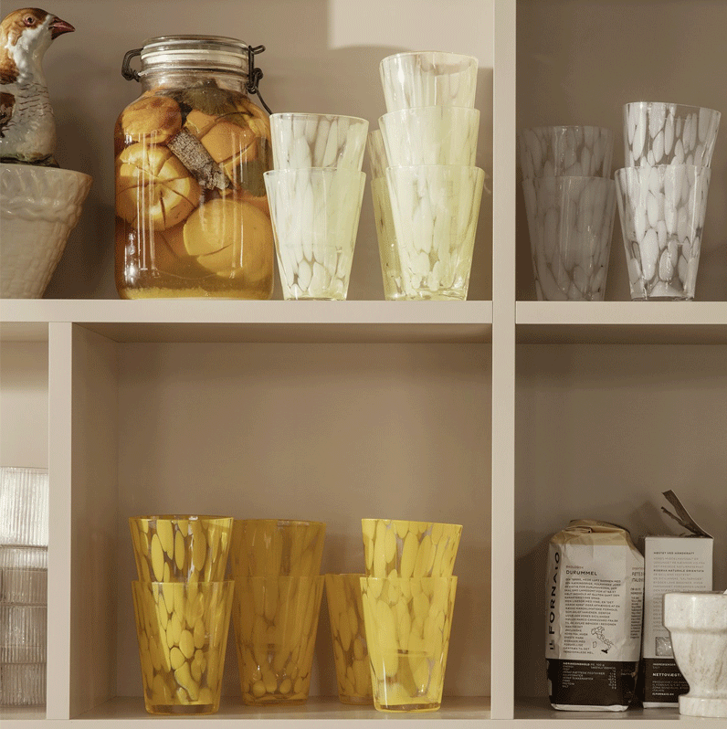 The Casca Glasses are a playful, colourful addition to your glassware collection. The mouth-blown glass has an asymmetrical, organic shape that sits comfortably in your hand, and the irregular pattern of monochrome spots is unique to each individual glass.