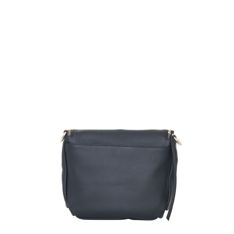 Details: Zipped flap closure with magnetic fastening, the fold hides a deep pocket inside; exterior back drop pocket with magnetic closure; detachable and adjustable long leather strap to be worn over the shoulder or across the body; gold-plated hardware; interior secure zip pocket; two cellphone drop pockets.