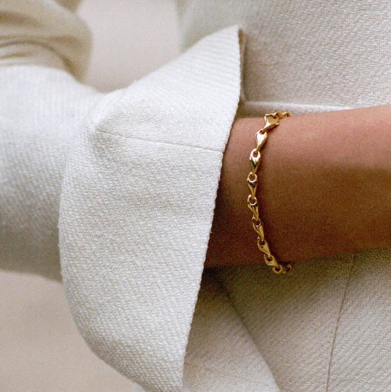 Sophisticated by nature, the Dahlia Bracelet is a trimmed row of perfect petals, linked together to form an infinite circle. Its repeated, organic form is a delicate statement on an exposed wrist, or is equally happy worn layered.