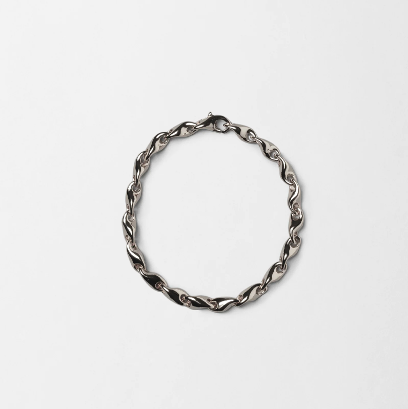 Crafted in sterling silver and plated in rhodium. Each individual link measures 12mm, entire bracelet length 18cm.