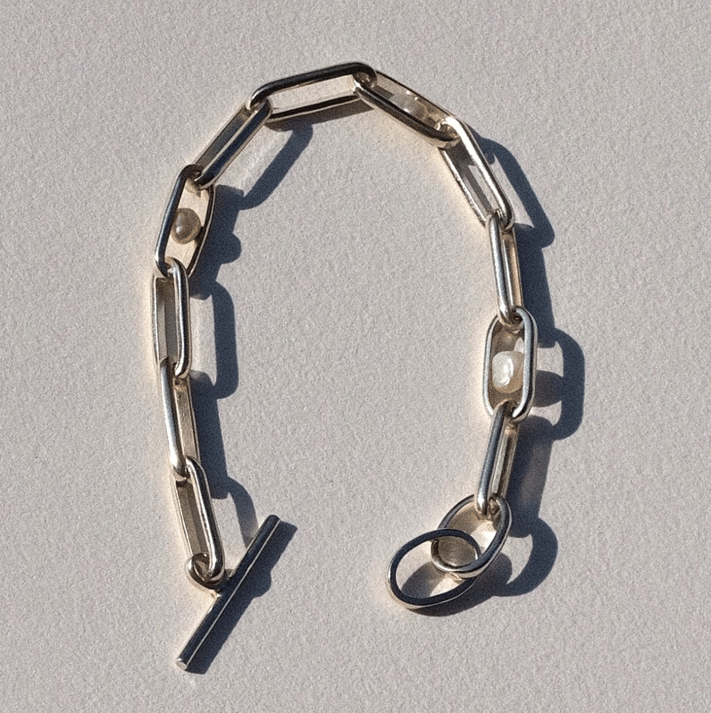 Elongated oval links encircle the wrist, coming together with a toggle closure that accents the timeless quality of the piece. Organic sea pearls are placed irregularly throughout the chain.