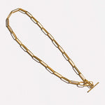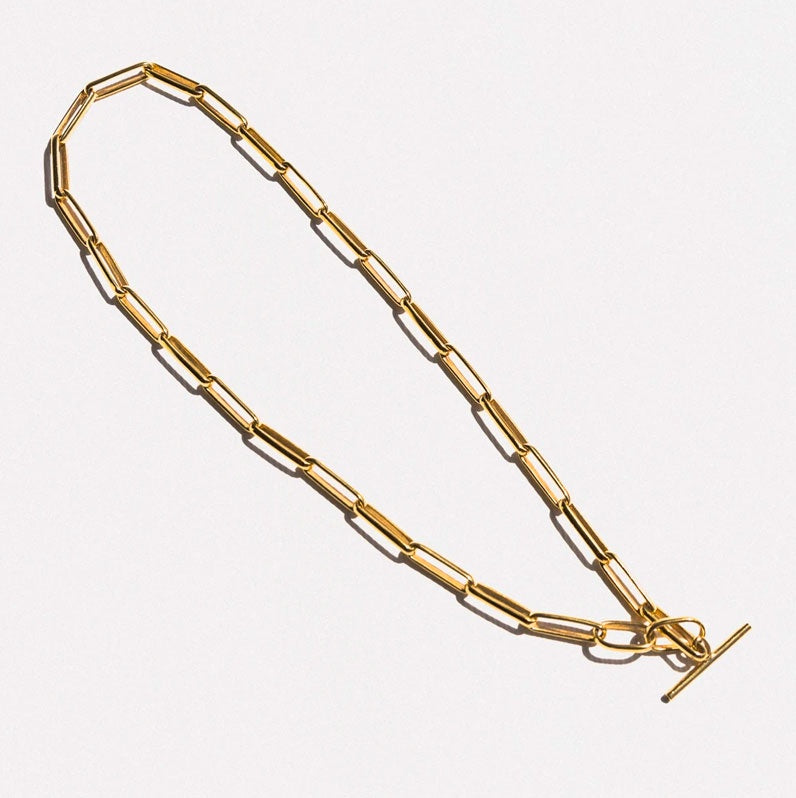 Elongated oval links encircle the neck, coming together with a toggle closure that accents the timeless quality of the piece. Toggle can be worn sitting at the back, or pulled through the loop at the front, elegantly falling down the neck.