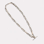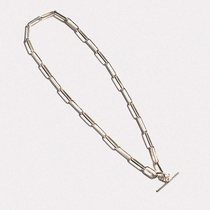 Elongated oval links encircle the neck, coming together with a toggle closure that accents the timeless quality of the piece. Toggle can be worn sitting at the back, or pulled through the loop at the front, elegantly falling down the neck.