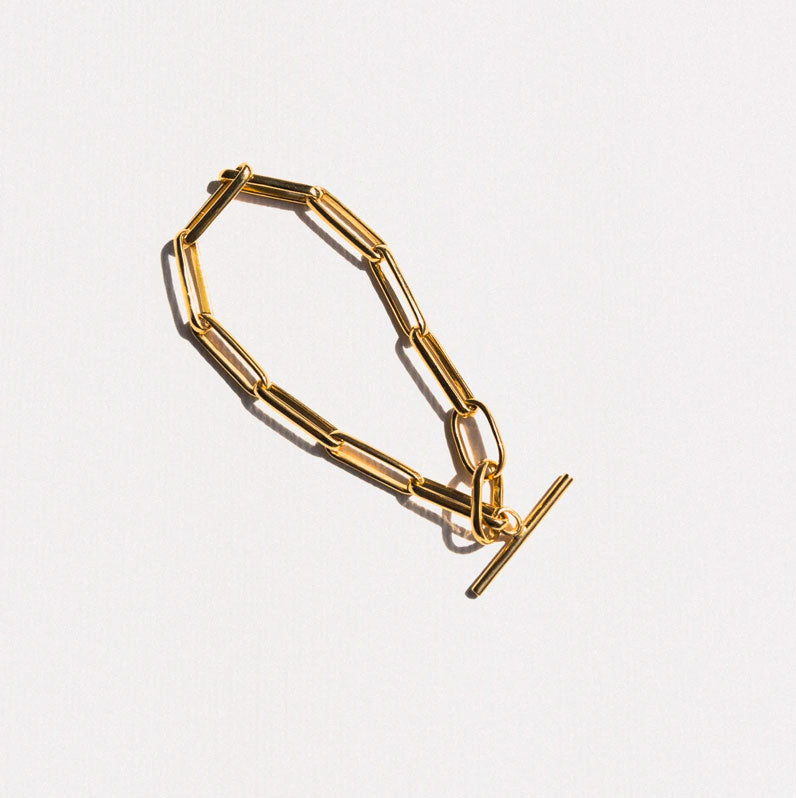 Elongated oval links encircle the wrist, coming together with a toggle closure that accents the timeless quality of the piece.