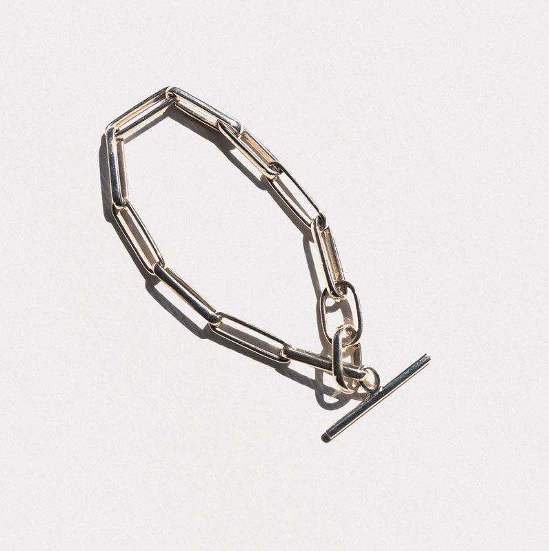Elongated oval links encircle the wrist, coming together with a toggle closure that accents the timeless quality of the piece.