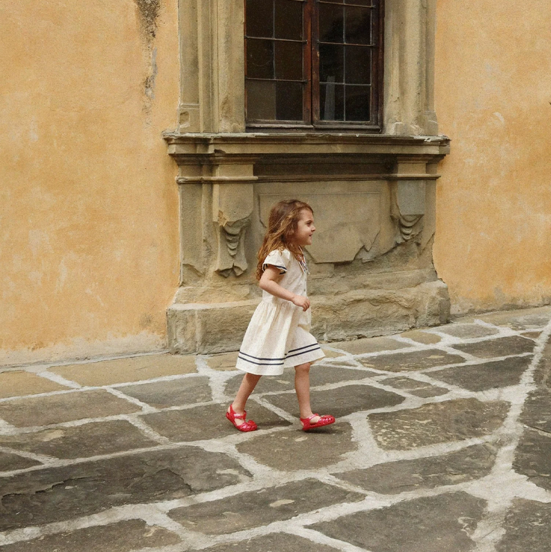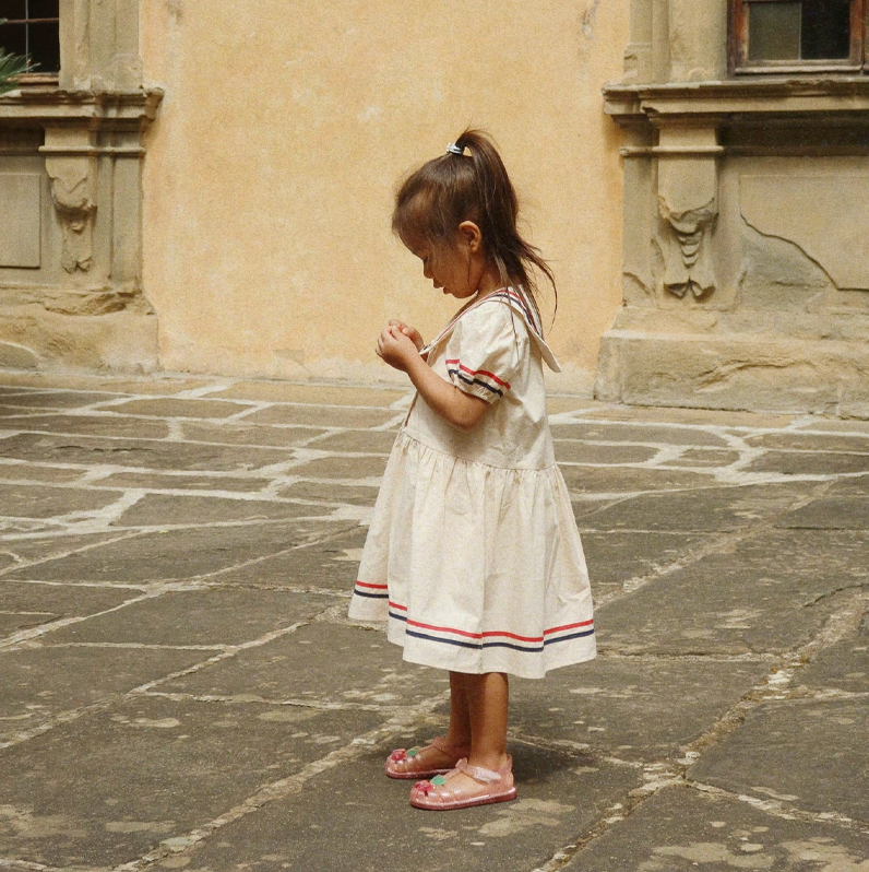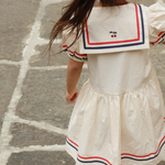 Sailor-inspired dress with a soft silhouette, an oversized naval collar, and puffy sleeves. Gathered at the waist for a flattering silhouette.