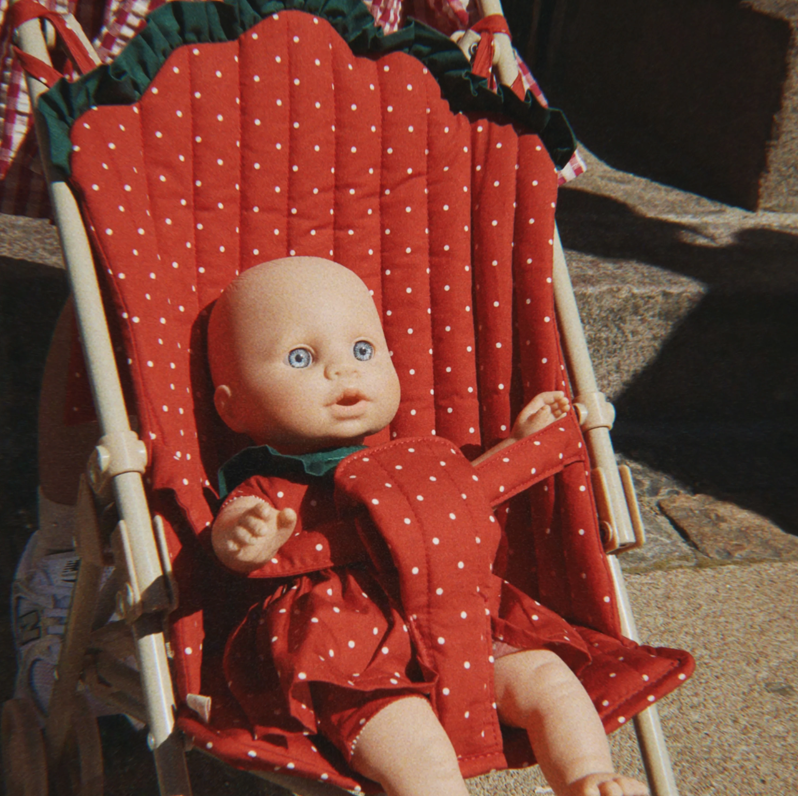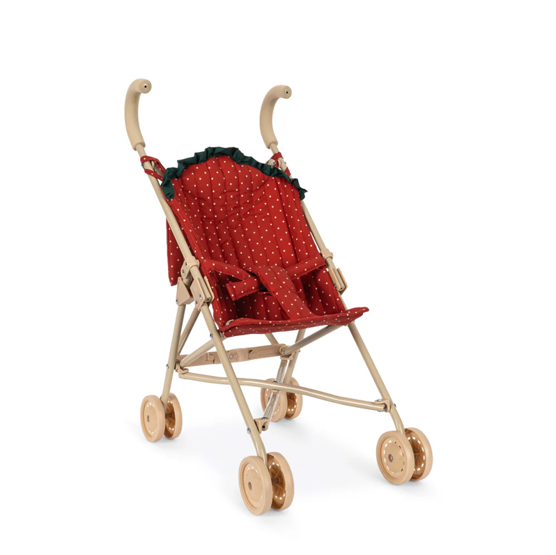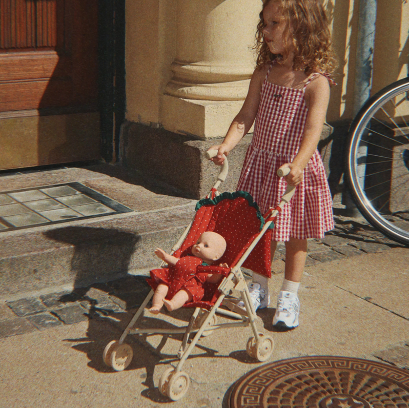 Introducing the Kids Doll Stroller/Pram by Konges Sløjd in the sweet print! This adorable doll stroller is thoughtfully designed with a harness, carriage bag and double wheels on all four legs for extra stability. The pram features removable fabric and comes the fully assembled. With its easy-to-fold design, storing this stroller is a breeze. Crafted with a sturdy iron frame and featuring soft, spongy handles, it’s both durable and comfortable for little ones to handle.