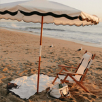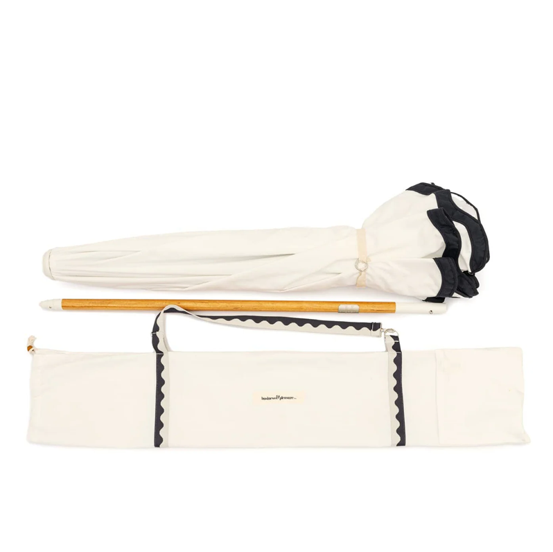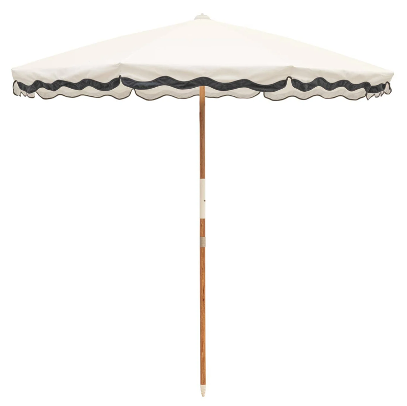 The Amalfi Umbrella. Intentionally designed to be simple, strong and elegant. Its flat Mediterranean style profile provides maximum coverage to shade a family of four at the beach. The removal of the fringe and hinge allowed us to increase the strength of poles and ribs for a more durable design that also accommodate more contemporary tastes.