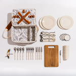 Picnic Essentials: Includes 4 melamine plates, 4 melamine cups, 4 sets of bistro flatware, 1 bottle opener, 1 cheese knife, 4 coaster and 4 napkins.
