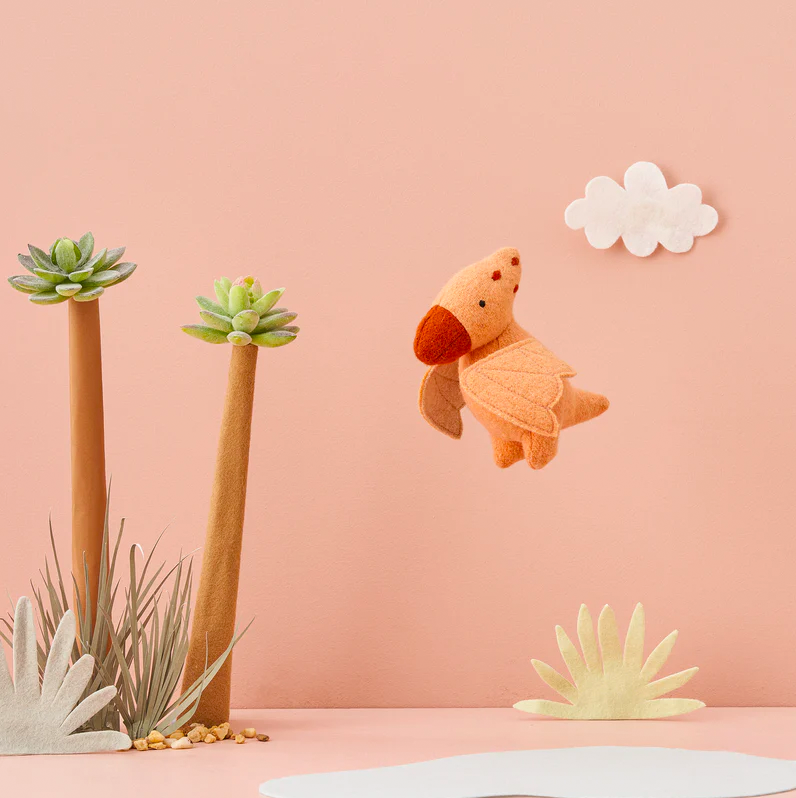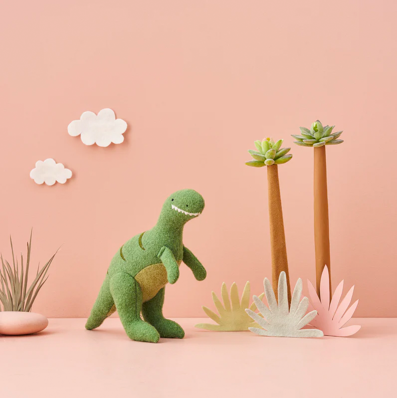 Come and explore the prehistoric world, where you will meet its resident Dinosaurs Pterodactyl, T-Rex and Ankylosaurus. Handmade from a soft wool blend with embroidered features, these three dino friends are the perfect size for small hands and make wonderful prompts for hours of imaginative play.