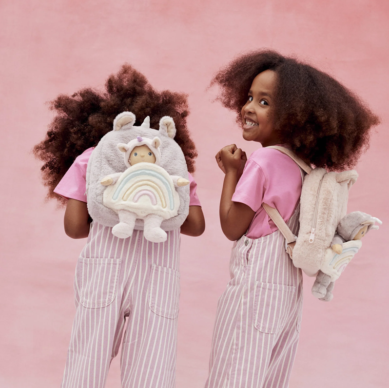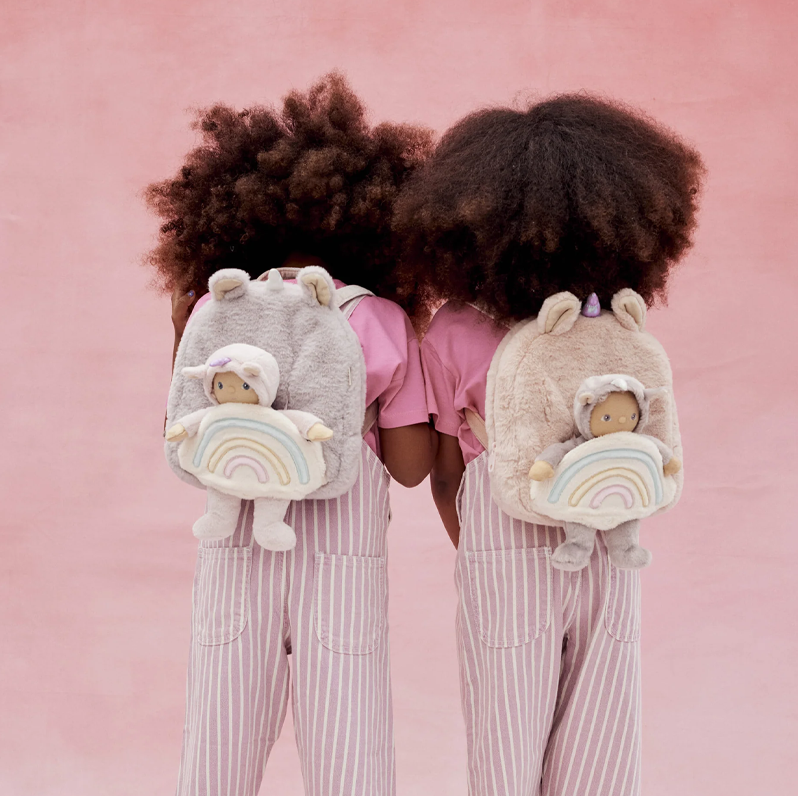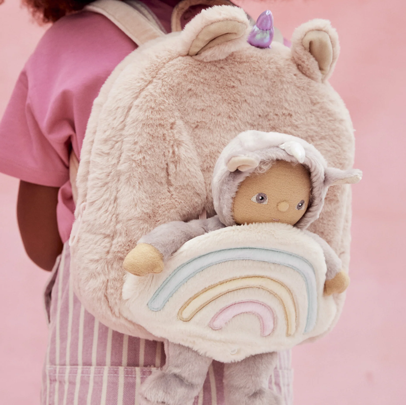 The plush rainbow pocket on the front is just the right size for a little friend to tag along (Our Unicorn Dinky's love to hang out here), complete with elastic loops and leg holes to keep them snug on the go. When it's time to tuck the doll away, simply close the bottom with the handy plastic poppers. Inside the rainbow pocket, you’ll find a tiny secret space, perfect for stashing little treasures.