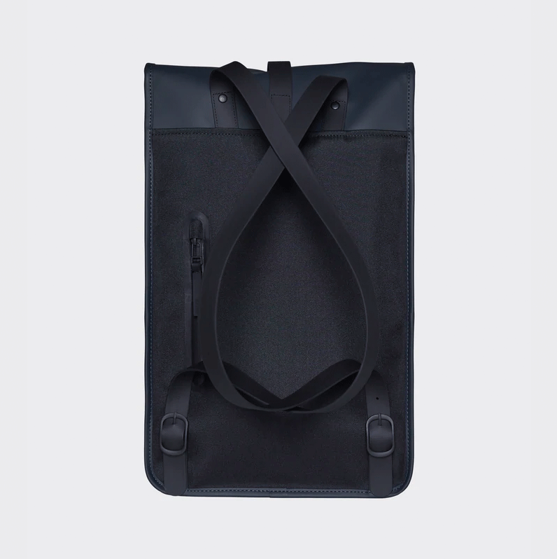 Backpack is cut in Rains’ signature waterproof PU fabric, engineered for carrying strength, durability, and a smooth feel.