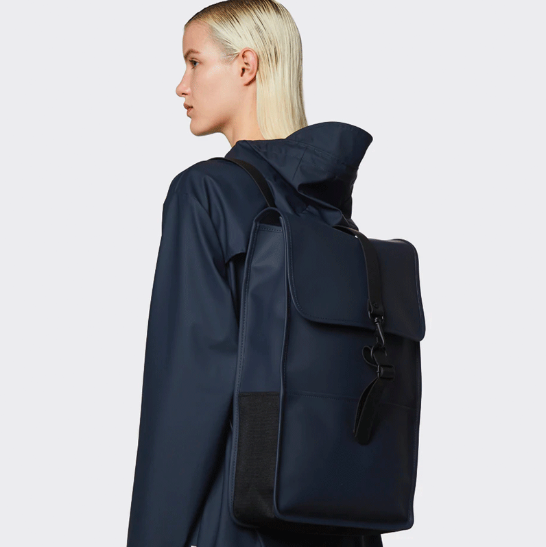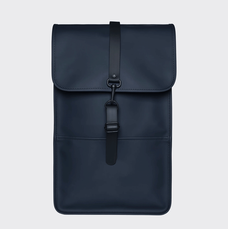 The Backpack silhouette is a Rains classic, characterized by its prominent flap and central strap with carabiner closure. This clean and ever contemporary waterproof rucksack features an internal laptop pocket, a spacious main compartment, and a concealed external phone pocket on the back panel.