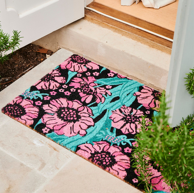 Welcome home with our charming Tumbling Flowers Black Coir Door Mat – the perfect way to greet guests and make your entryway one to remember. Made from durable, natural coconut coir fibres, this door mat is designed to withstand the elements while adding a bit of Kip&Co colour and personality to your doorstep. Featuring cascades of popping pink peonies with wisps of blue green leaves on a black base, this door mat and its robust texture effectively traps dirt and debris, ensuring your home stays nice and tidy - a must-have for any home.
