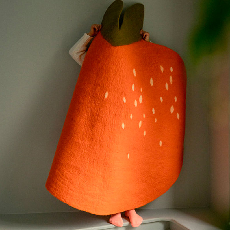 The VEGGIE RUGS are 2 forms of sumptuous, joyful, and innocent fruit. The clementine and the pear, round and abundant, might have been designed by a child. They have a certain comforting aspect of "vintage" objects from our childhood… The fruits that put us in a good mood! Put them in the bedroom, where kids can lie down and play on them, but why not also in the kitchen or the entrance for a playful, joyful, and tasty decoration!end time on it to play or laze around enthusiastically!