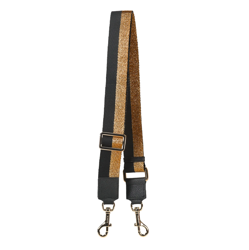 Details: Cotton webbing; black leather trim, adjustable; gold-plated hardware, 3.5cm wide, 78cm to 125cm long.