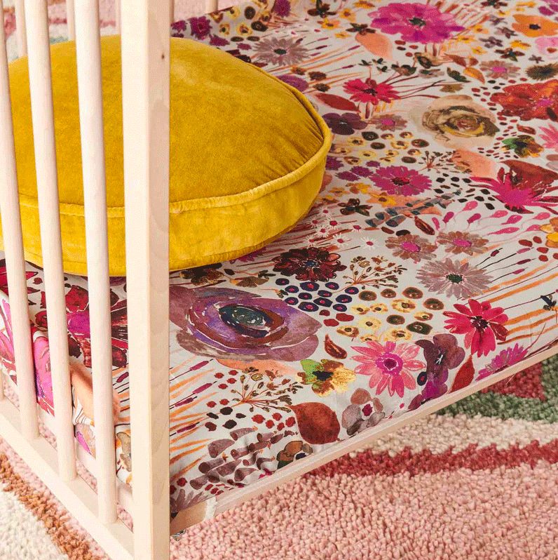 The Field Of Dreams organic cotton fitted sheet features Kip&Co's most iconic hand painted floral print in pinks and purples on a silver grey base. Style tip: layer up with a flat sheet and quilt cover from our expansive range of organic cotton, printed and plain linen bedding. Mix and match is best!