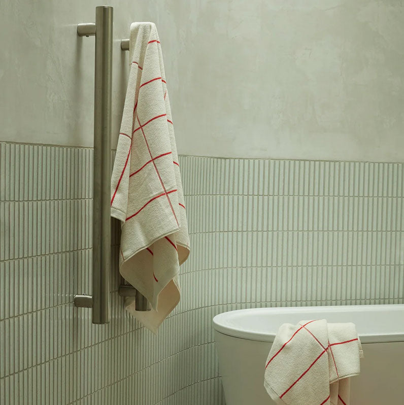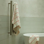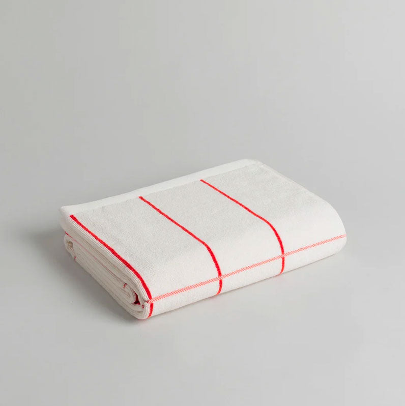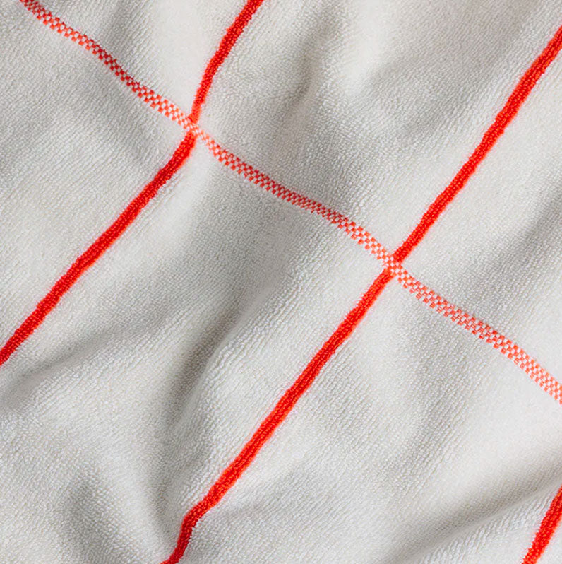 BETHELL is a luxuriously soft bath towel in 100% Organic Cotton. Featuring a grid pattern in contrasting colours of Paloma Sun (red) and Ecru (fawn), this towel exercises restraint and refinement. Defined by the pairing of a bold vertical terry stripe and an embroidered gridded check, it references the checkerboard - a pattern synonymous with BAINA & the set it was designed to complement.