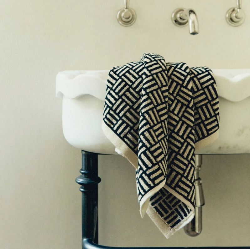 Conveying a sense off modernity sink side, the Torrens Hand Towel features a geometric weave print inspired by the rhythmic repetition seen in Art Deco tiling. Crafted from 100% organic cotton.