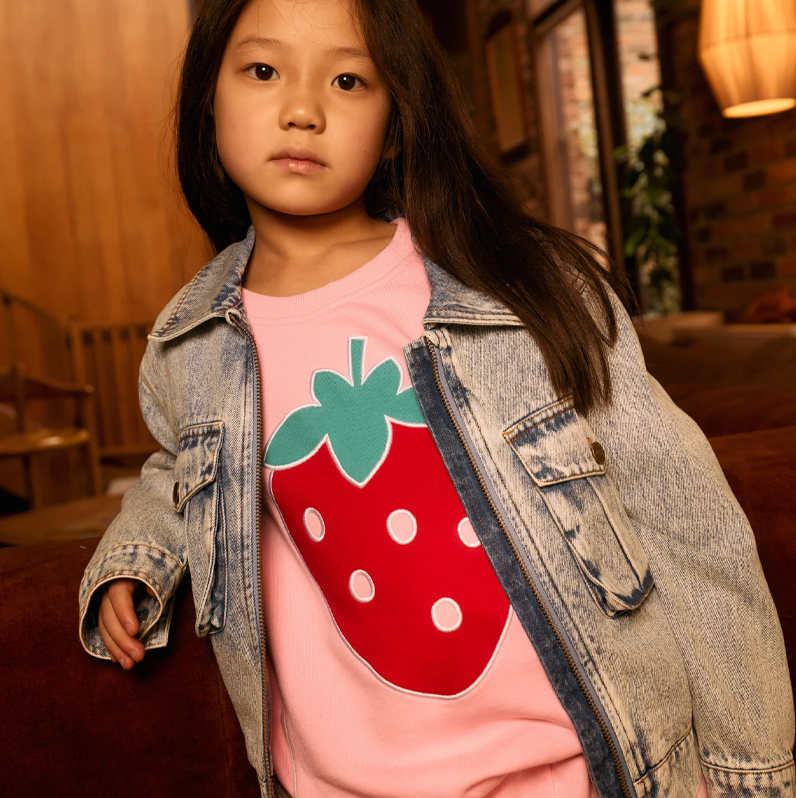 Bright pink sweater in soft loop-back cotton, starring a giant, show-stopping strawberry on the front – because go big or go home, right?!