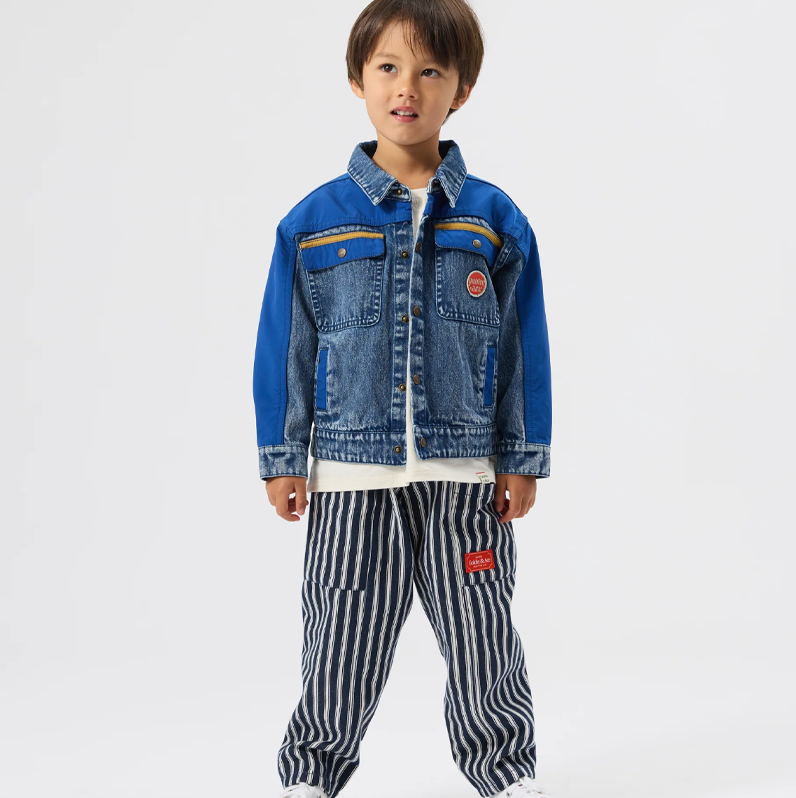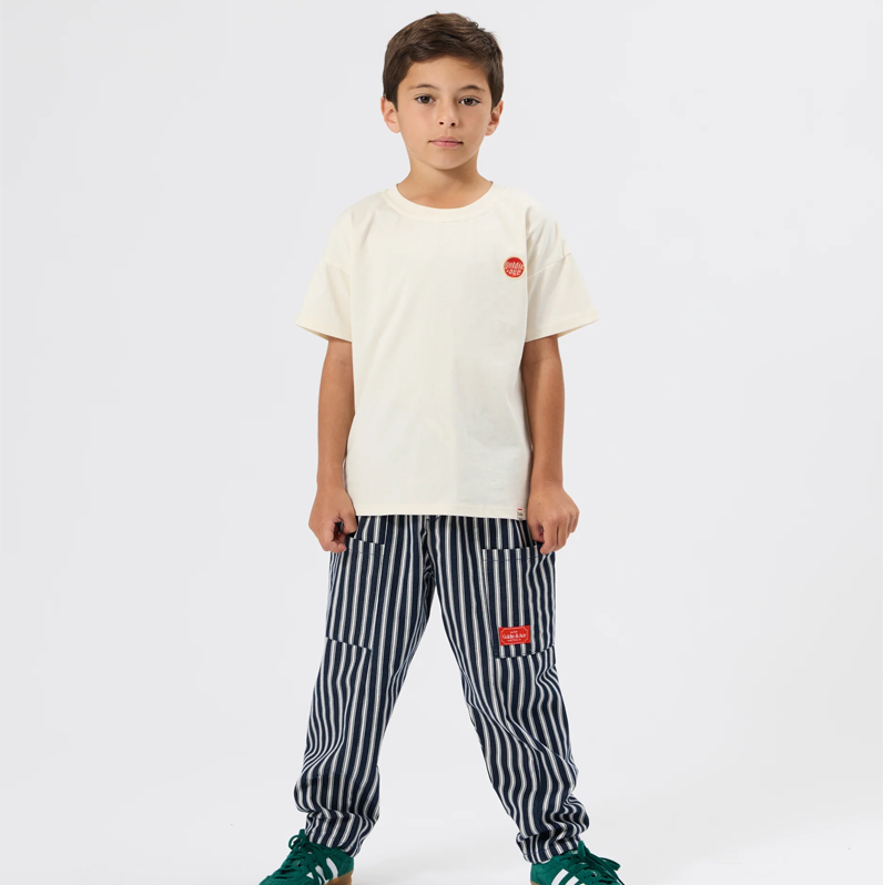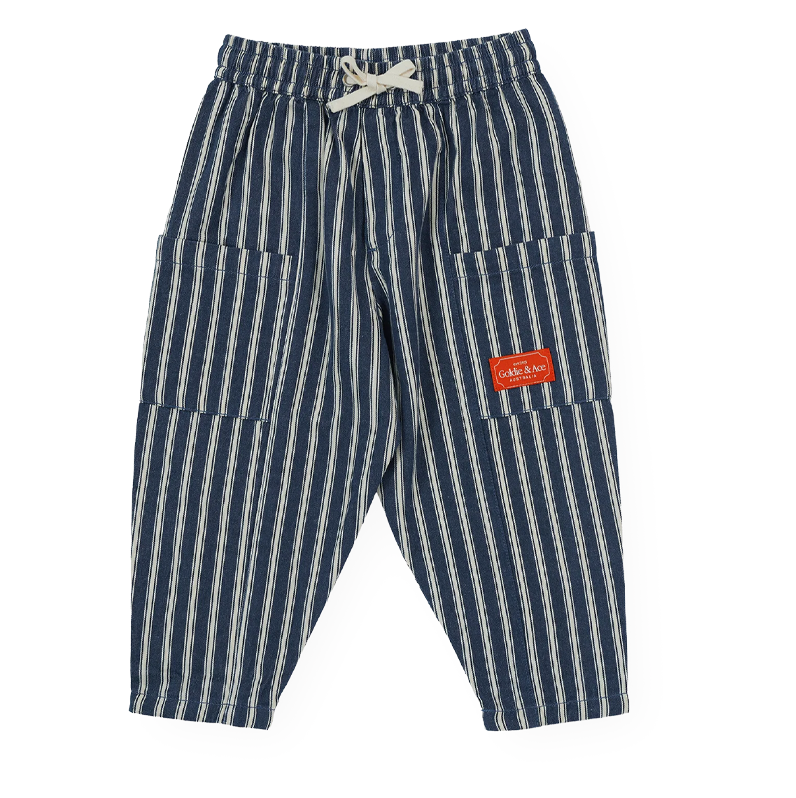 All aboard the fun train with these indigo stripe pants! Durable, roomy pants with an elastic waist, drawcord, and generous pockets – perfect for little adventurers to stash treasures and tackle every playground mission.