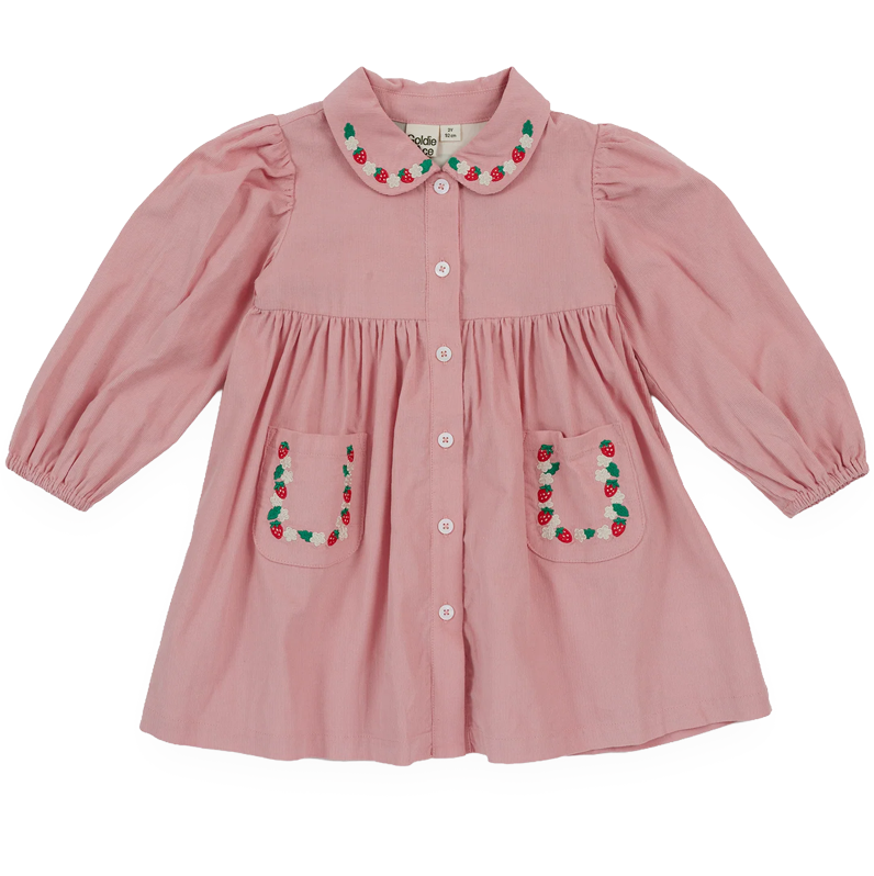 A pink cotton corduroy delight with a touch of whimsy, this dress is all about playful charm. The soft corduroy fabric is perfect for twirling, while elasticated cuffs keep sleeves in check.