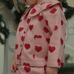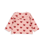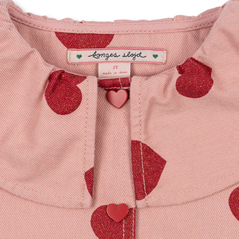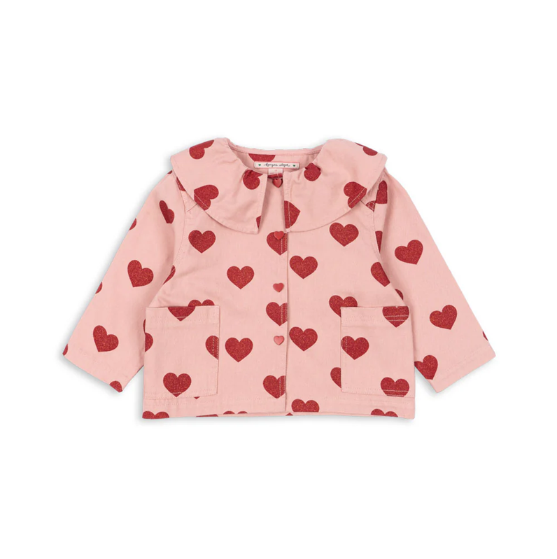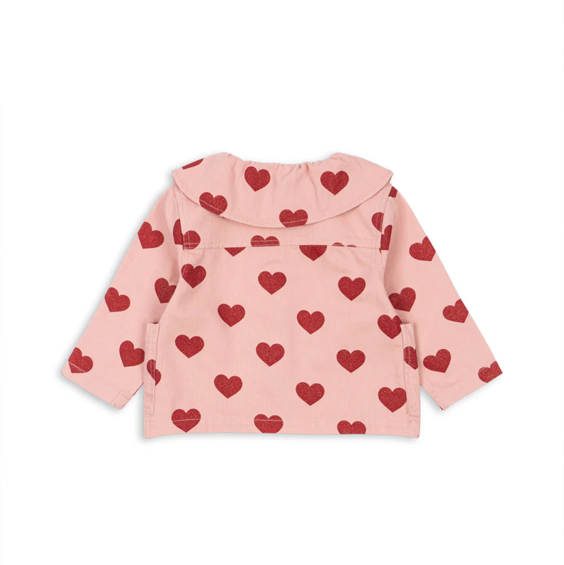 Shirt jacket with an all-over heart print and cute heart-shaped push buttons. Designed with a round collar and practical front pockets.