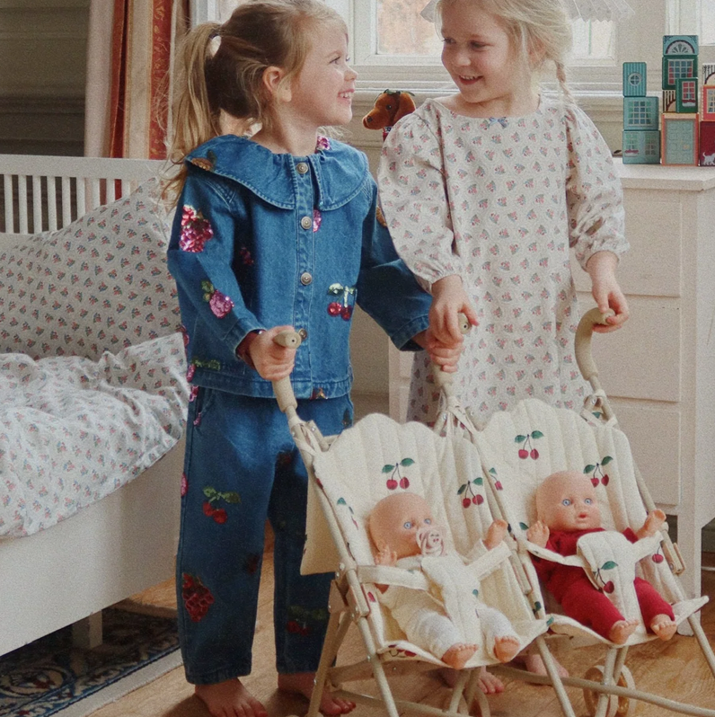 Soft denim shirt jacket with a rounded collar and embroidered sequin fruits.
