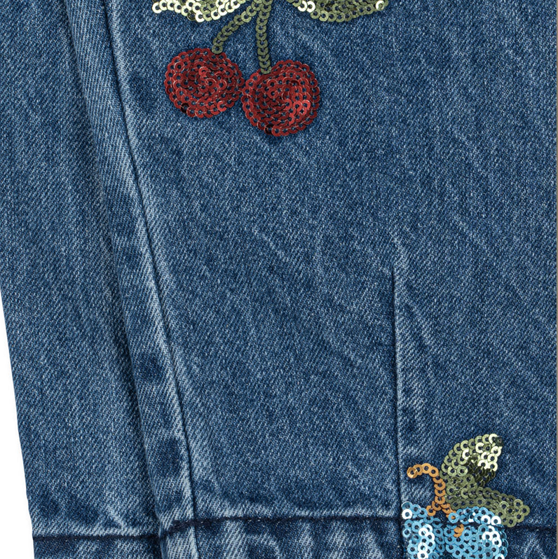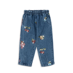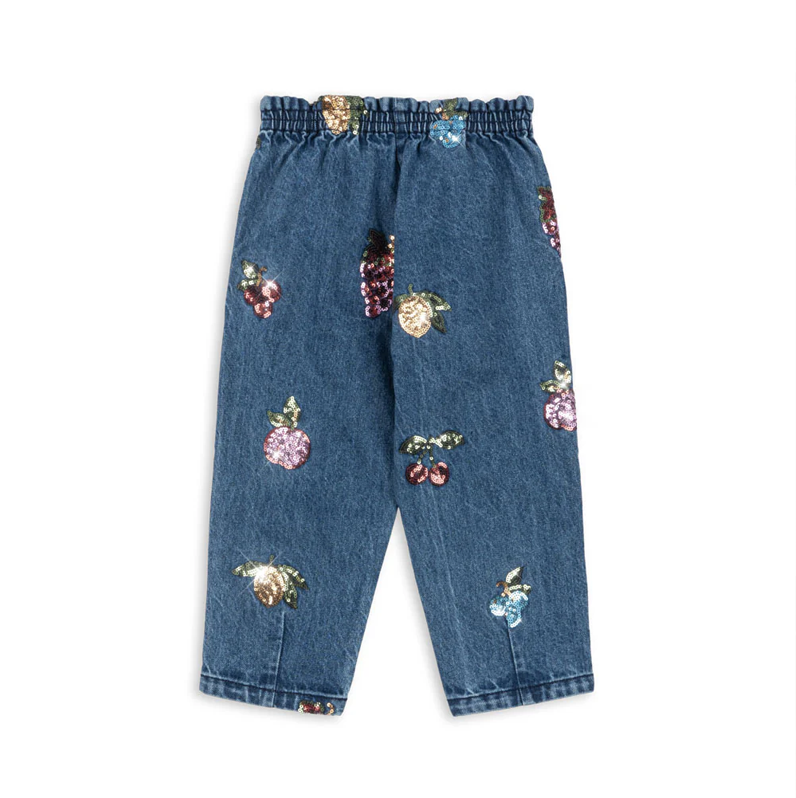 Soft pants in a durable denim quality. Designed with embroidered sequin fruits, a straight fit, and a comfortable elastic waistband.