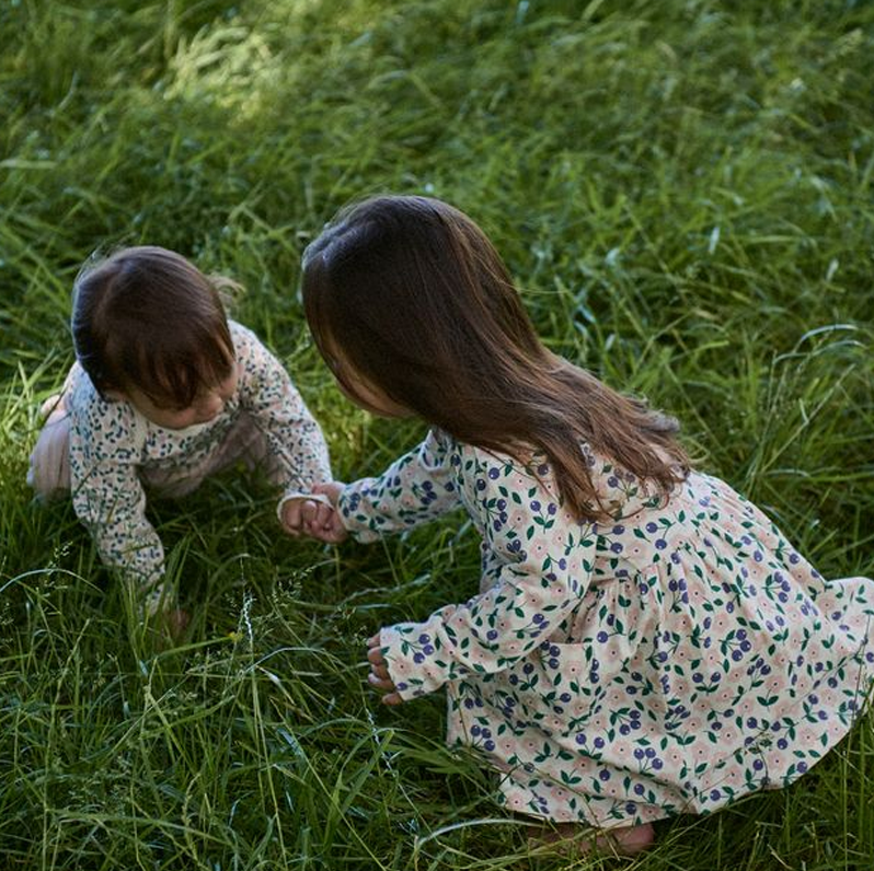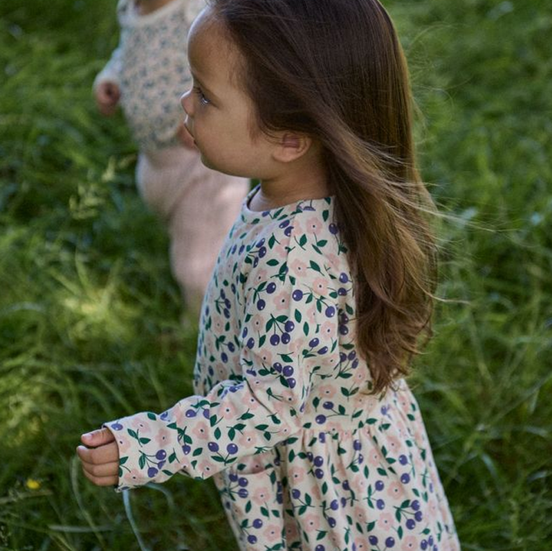 The sweetest little long sleeved dress from Nature Baby, in the seasonal navy pollyanna print. A classic long sleeve t-shirt style dress with a gathered hem skirt, a great classic piece for your little one. Made with organic cotton stretch jersey, it is light, breathable and comfortable and can be layered or worn on its own. Features two snap dome closures at the back neck for easy dressing.