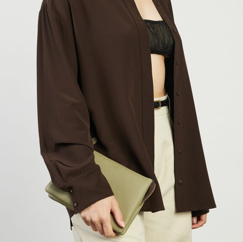 Details: Detachable and adjustable long leather strap to be worn over the shoulder or across the body; six drop card slots; gold plated hardware; interior secure zip pocket; outer zip fastening.