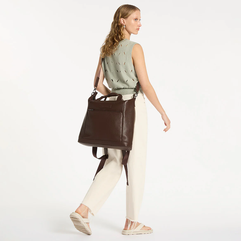Soft shrunken pebble leather Front zipper pocket Internal zipper pocket, and open pouch pockets