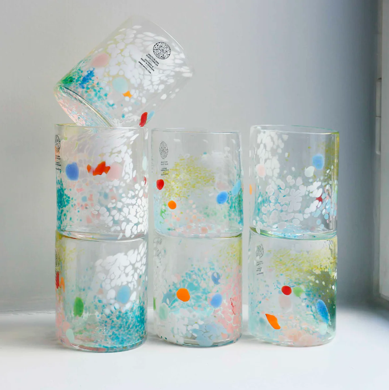 The Elf Glass is a colourful, unique, swirling tumbler inspired by magic elven dreams and spring flower meadows. 100% made in our downtown Copenhagen studio. No two are alike. Please note: Not suitable for hot beverages. Photos are only indicative.